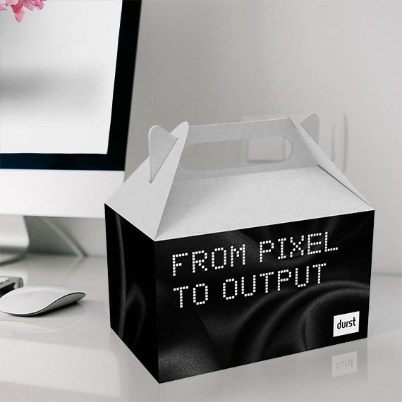 Die Konstruktion besitzt einen Griff aus Wellpappe und kann außen in glänzend oder matt bedruckt werden.